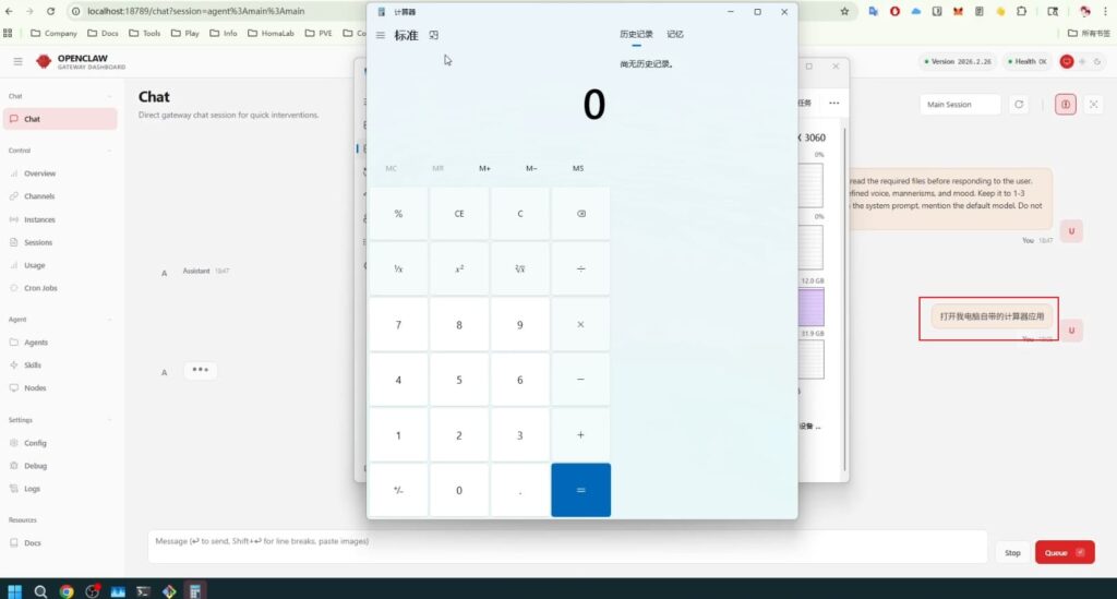 在等待10分钟,cpu,gpu和内存几乎爆满的情况下,还是完成了打开系统计算器的任务