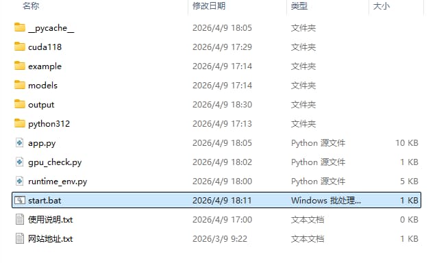 start.bat,无需手动配置 Python 环境或 pip install。 - 加载过程:终端会显示 CUDA 初始化进度,等待提示“服务已启动”后,浏览器会自动跳转至