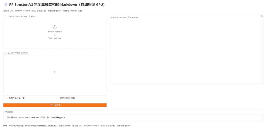- 性能差异:在相同硬件环境下,GPU 版的处理速度通常比 CPU 快 5-10 倍。特别是对于包含大量表格或复杂排版的 PDF,GPU 能显著降低等待焦虑。